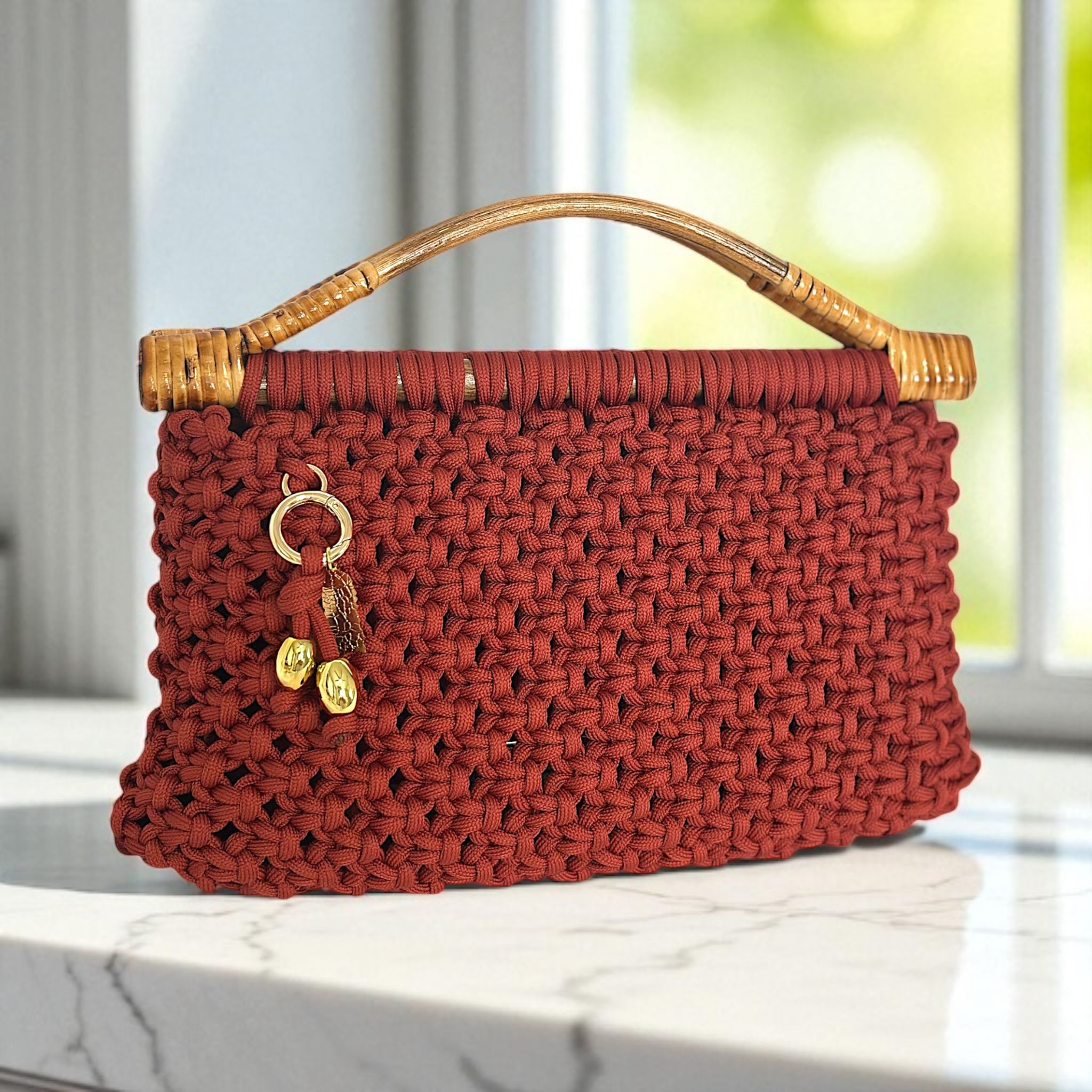 Cartera en macramé 100% "hand made" en hilo encerado con asa de bolso en bambú. Incluye nuestro charm removible de Bella Muse y nuestra Isla del Encanto.