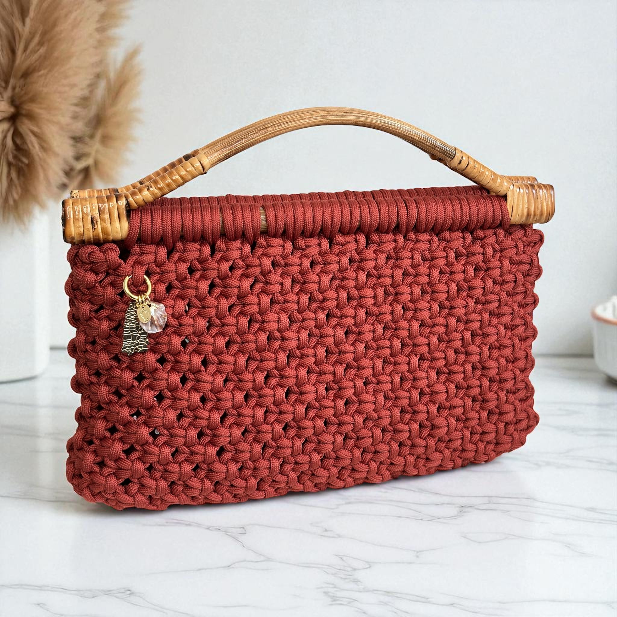 Cartera en Macramé hecha a mano con nuestro charm removible de Bella Muse y nuestra Isla del Encanto.