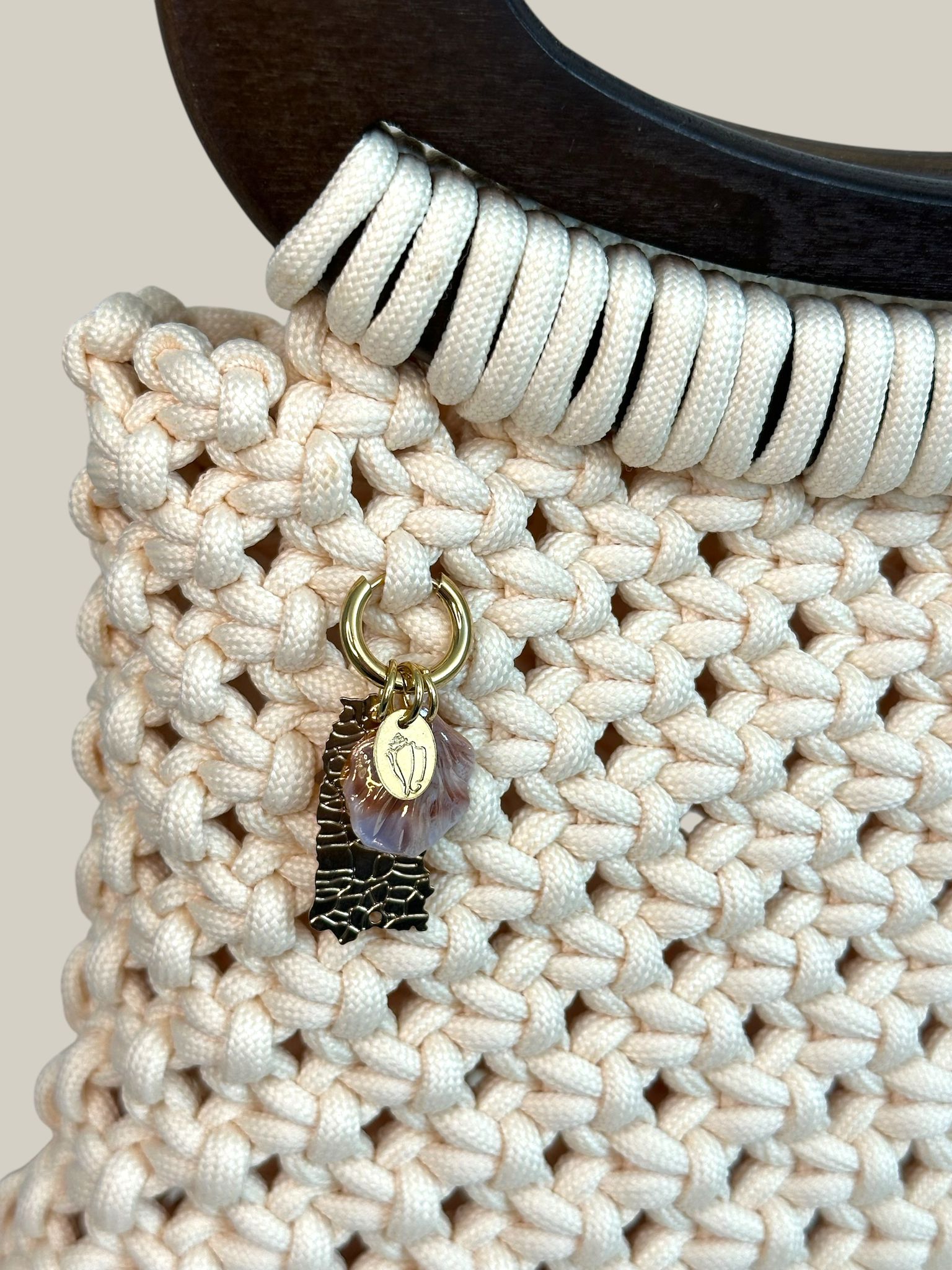 Cartera en macramé 100% "hand made" en hilo encerado con asa de bolso en bambú. Incluye nuestro charm removible de Bella Muse y nuestra Isla del Encanto.