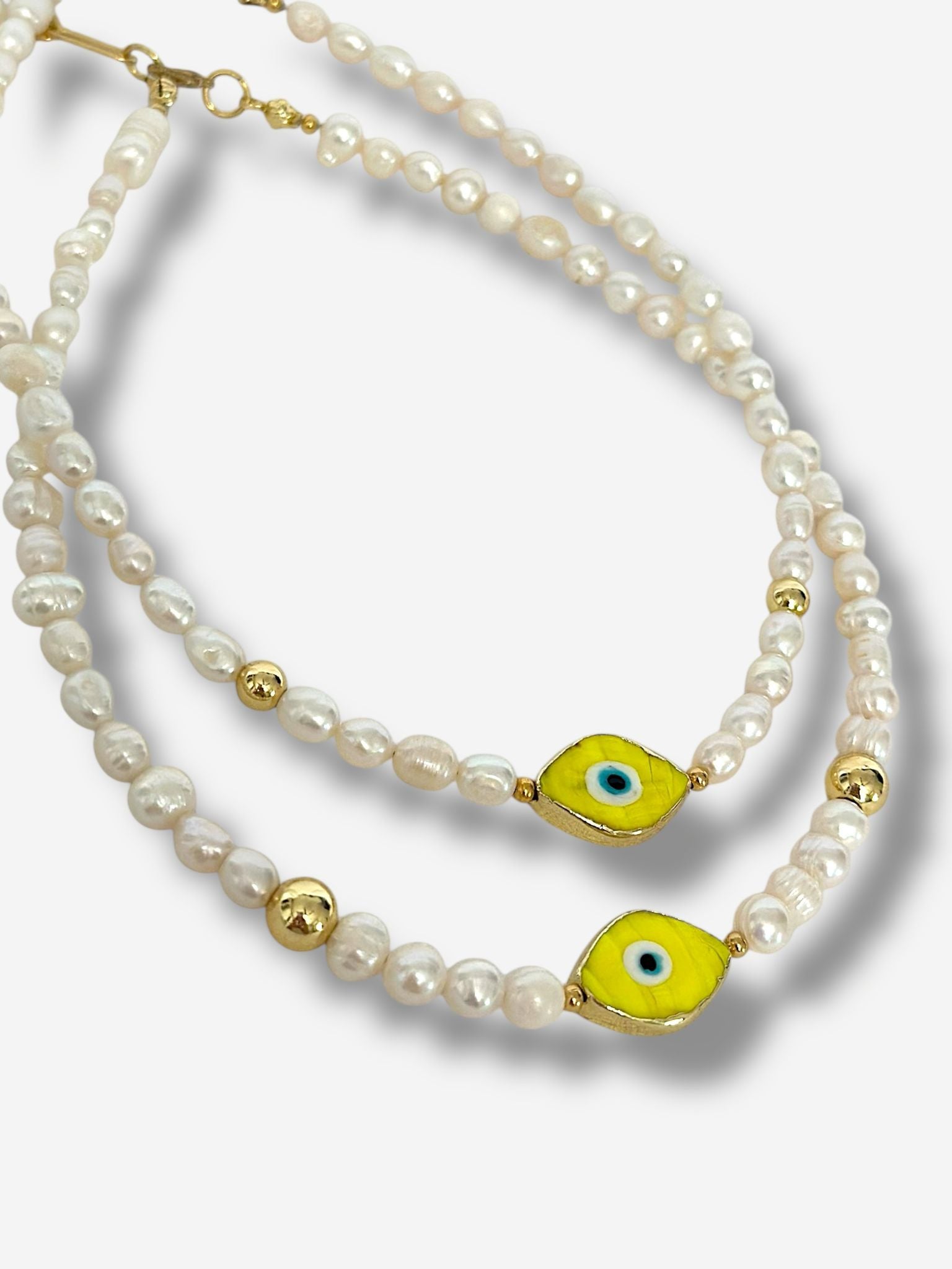 Gold plated en perlas de agua dulce y ojo protector.
